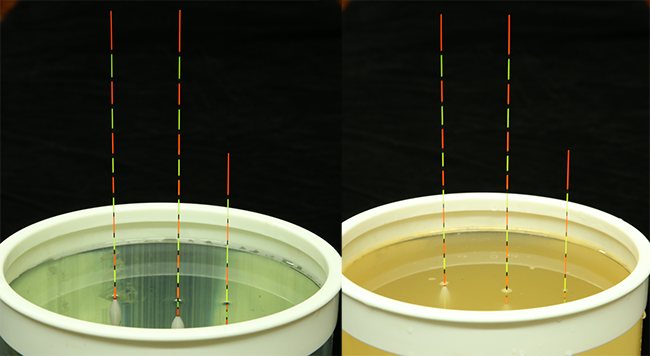 結論:不同的水體,雖然成分有變化,但對浮漂的影響非常細微,漂目上沒有變化,(在現(xiàn)實中,能夠讓魚類存活的水域,其水質含有泥漿、鹽分等其他成分的濃度不可能非常高),所以,“漲目”跟水質沒有關系。